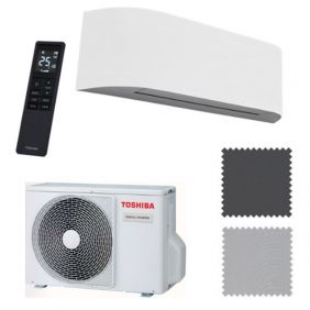 Toshiba Haori R32 Wifi intégrée Mono-split Mural RAS-B10N4KVRG-E. Ensemble comprend l'unité intérieure RAS-B10N4KVRG-E et l'unité extérieure RAS-10J2AVSG-E1 avec deux tissus standard COULEUR Gris clair et gris anthracite.